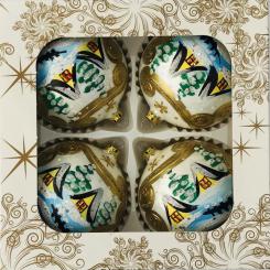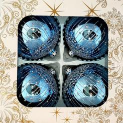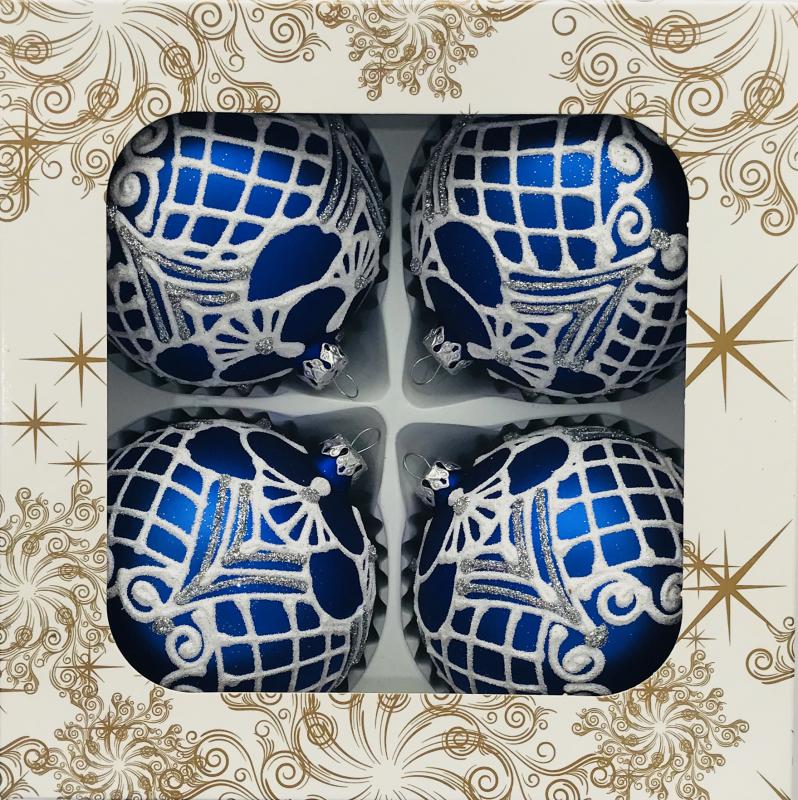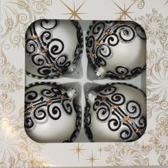Bombki dekorowane o średnicy 100 milimetrów, pakowane po 4 sztuki w pudełku.